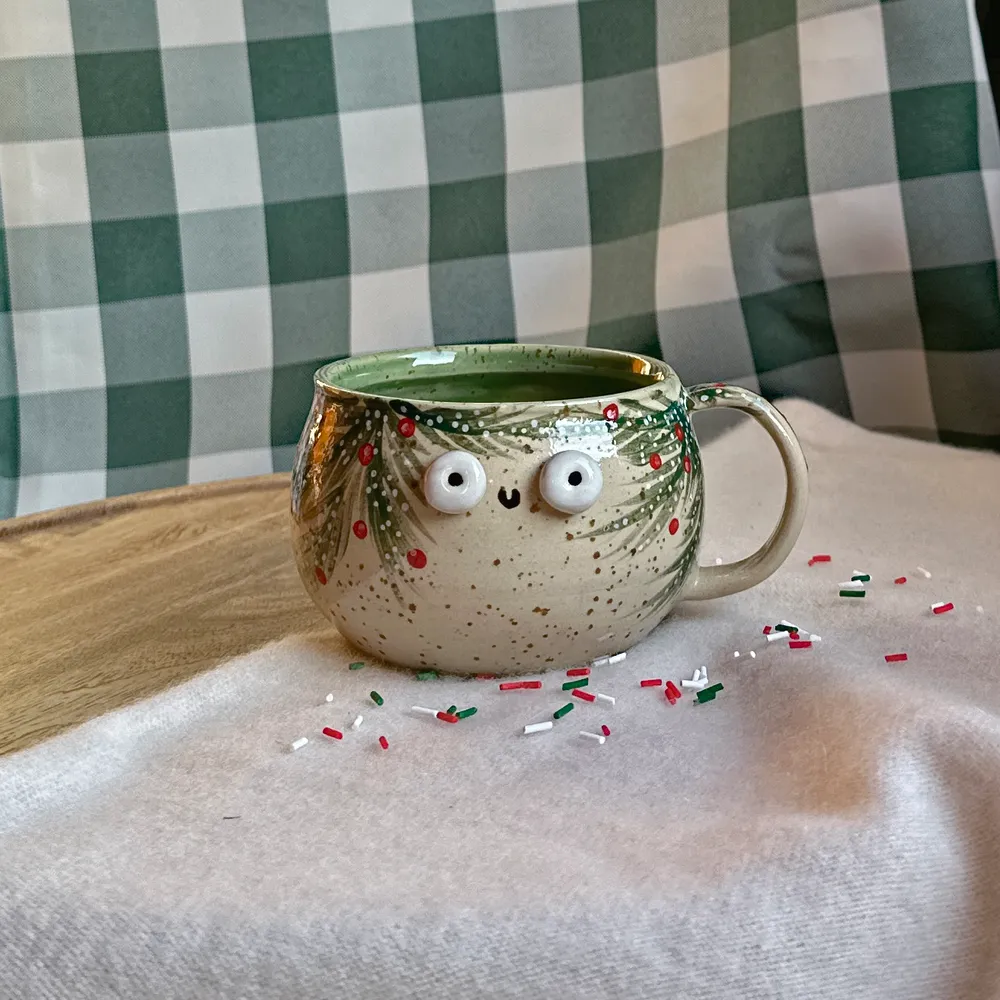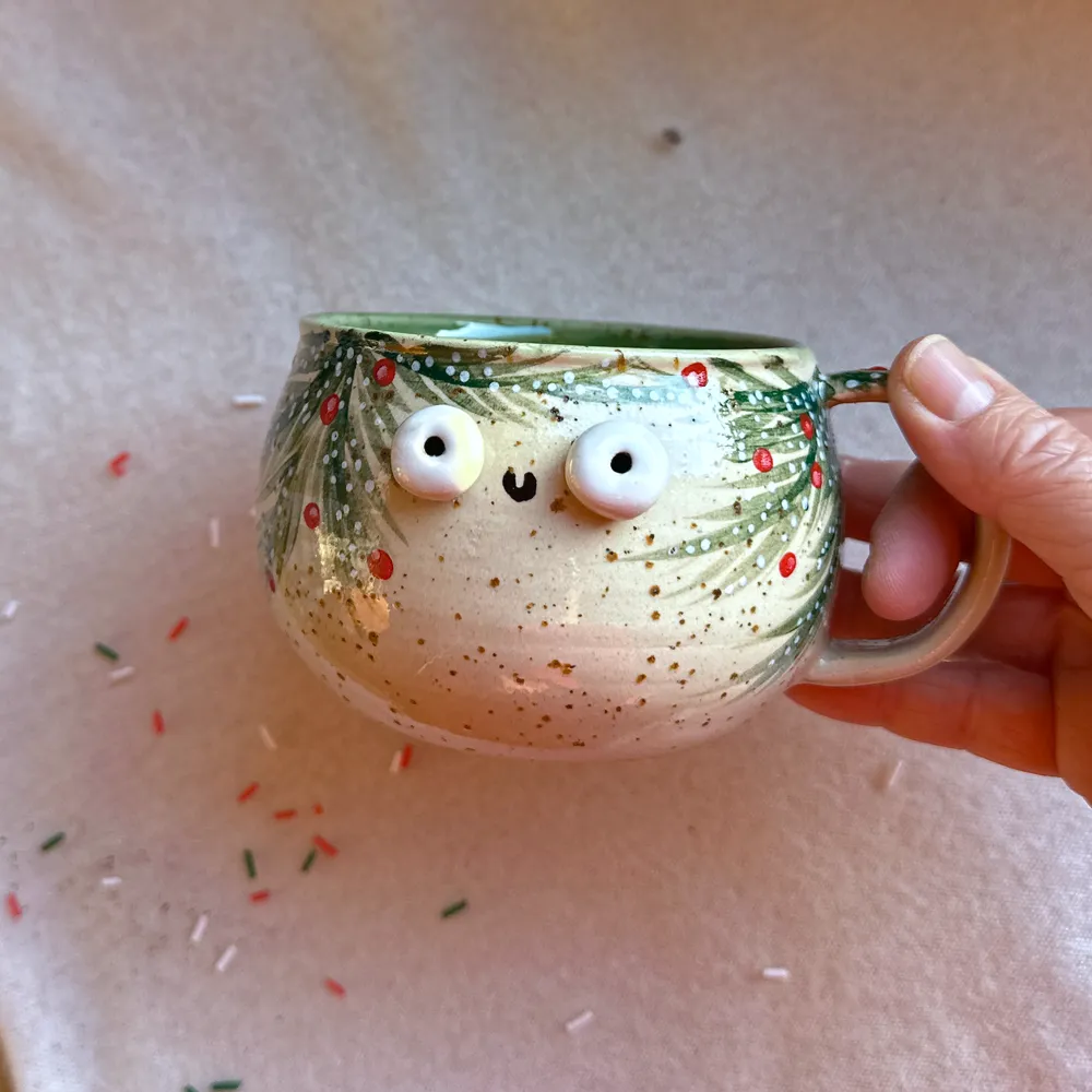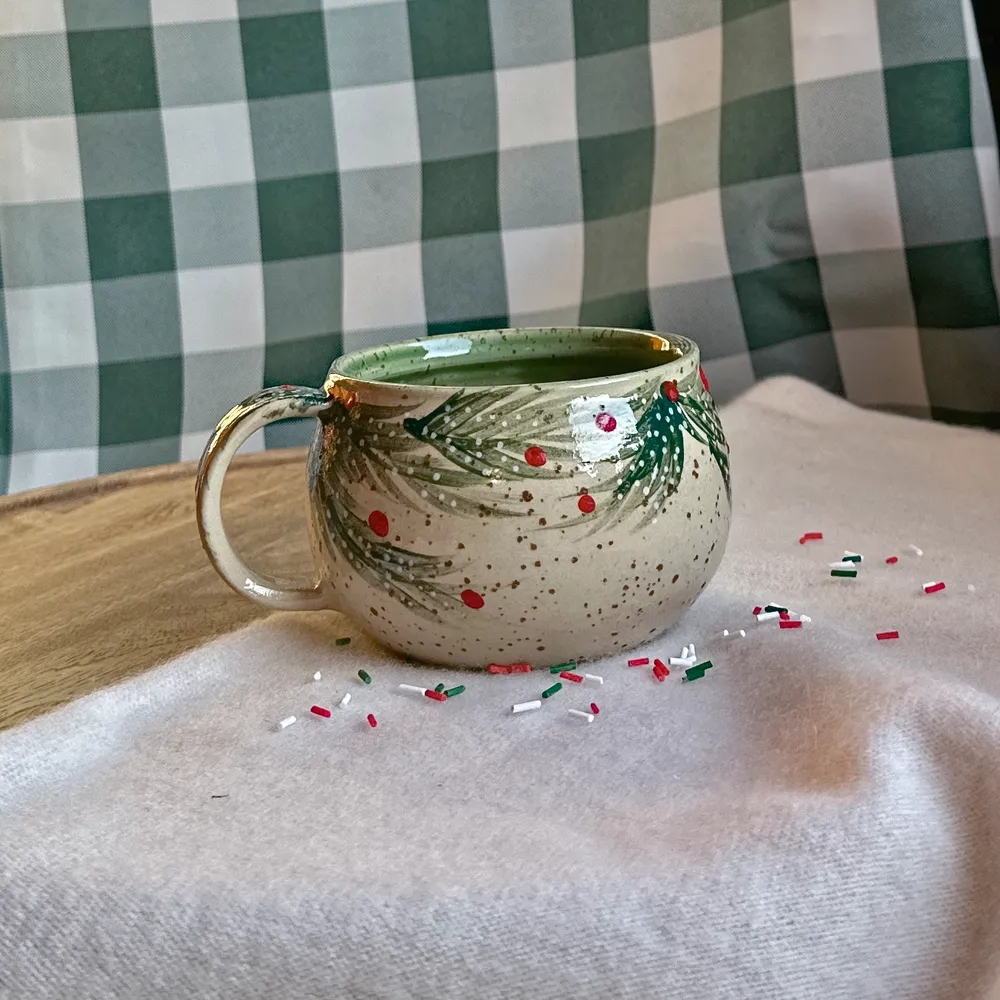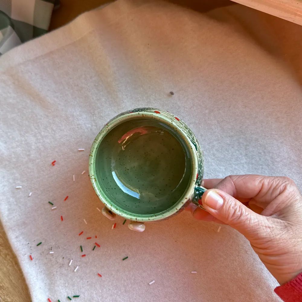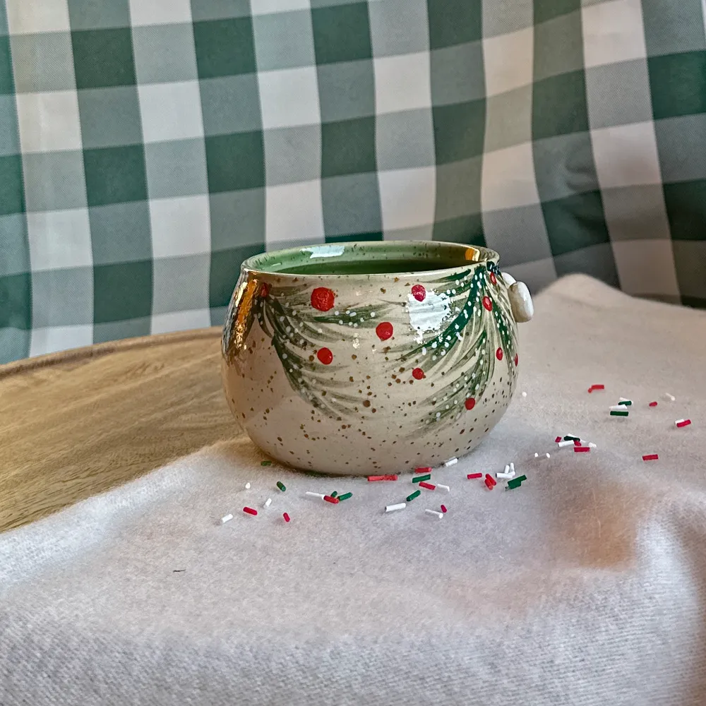Kubeczek został wytoczony na kole garncarskim z jasnobeżowej, kropkowanej gliny następnie ręcznie malowany.