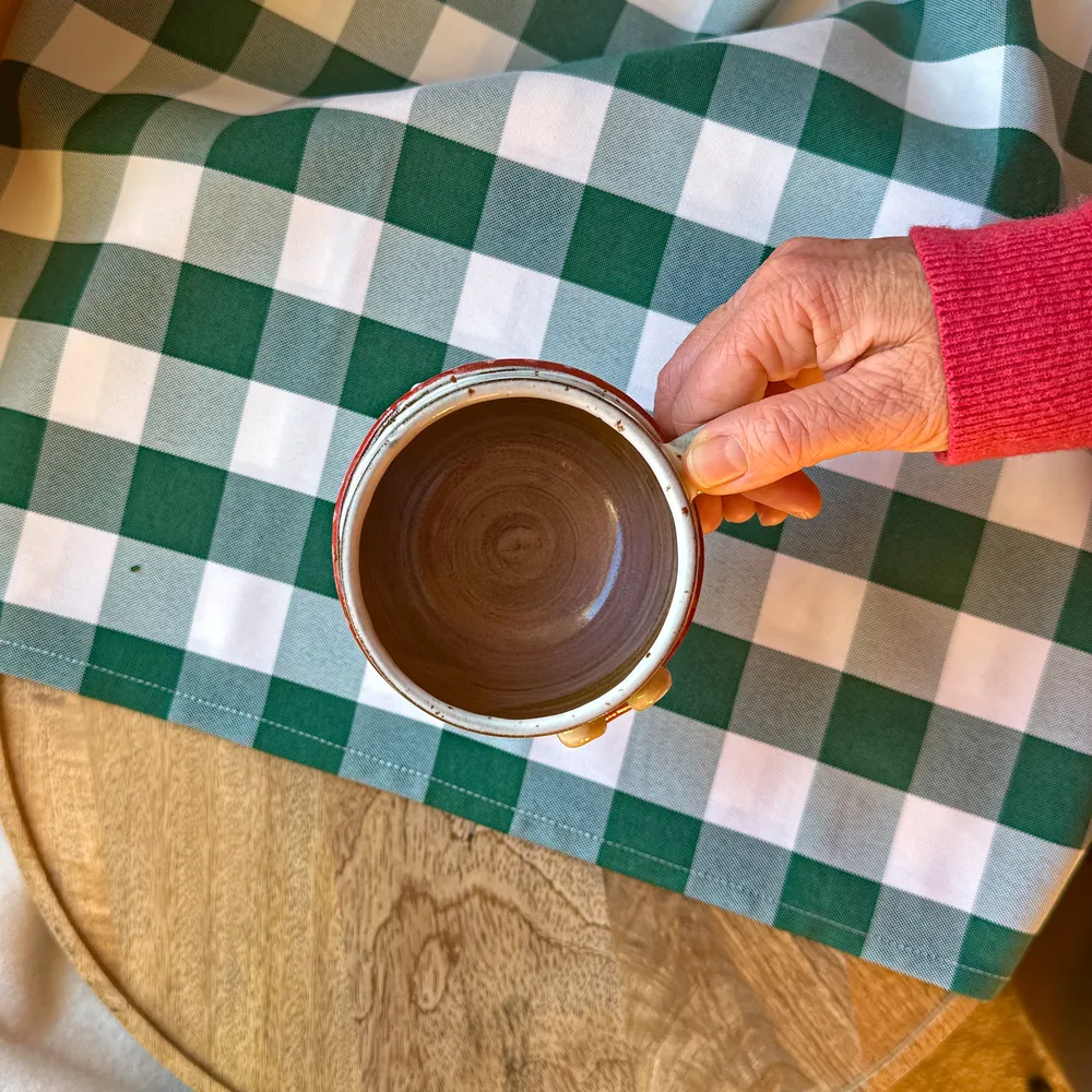 Środek pokryty białym szkliwem, dół kubeczka – surową przyjemna w dotyku gliną.