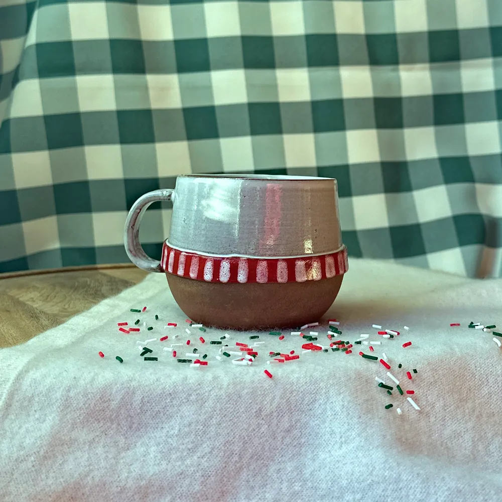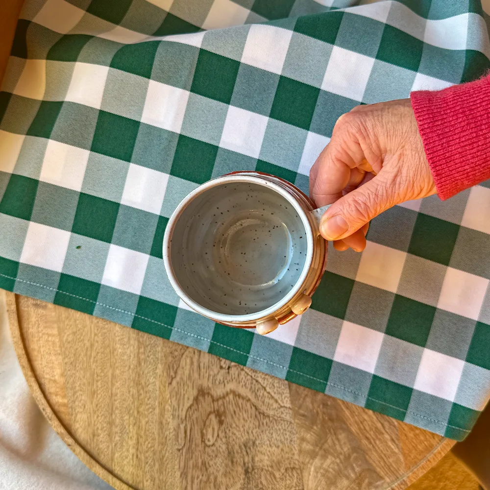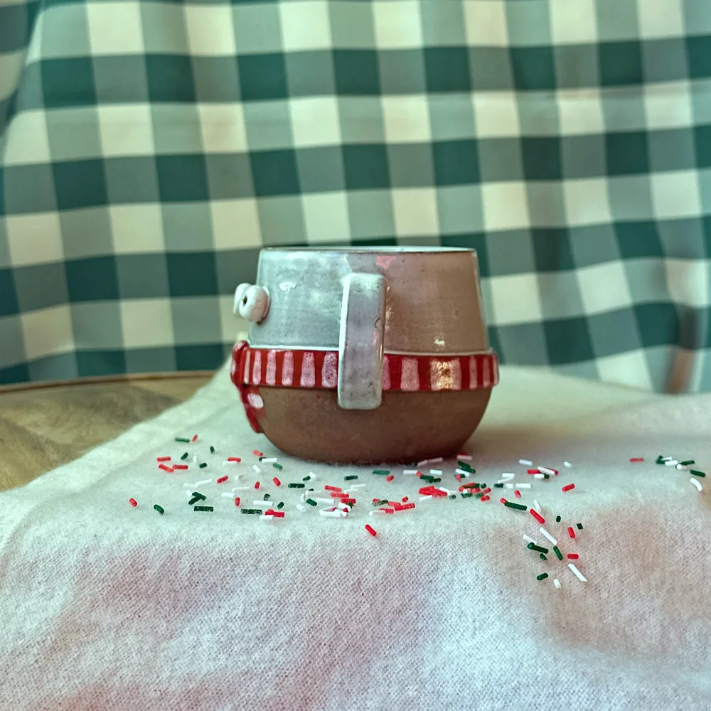 Środek pokryty białym szkliwem, dół kubeczka – surową przyjemna w dotyku gliną.