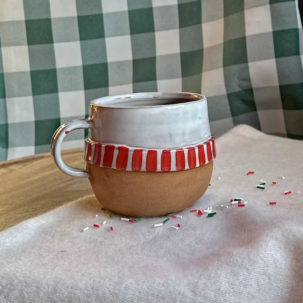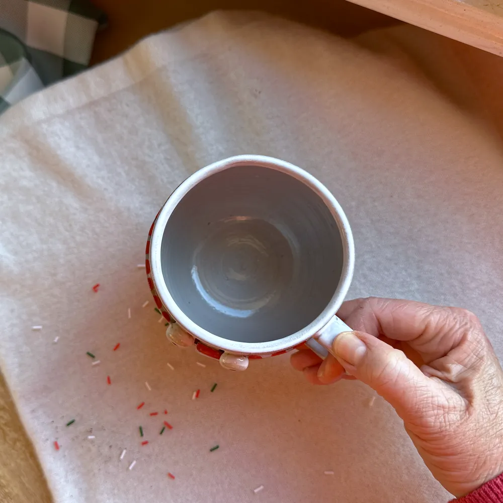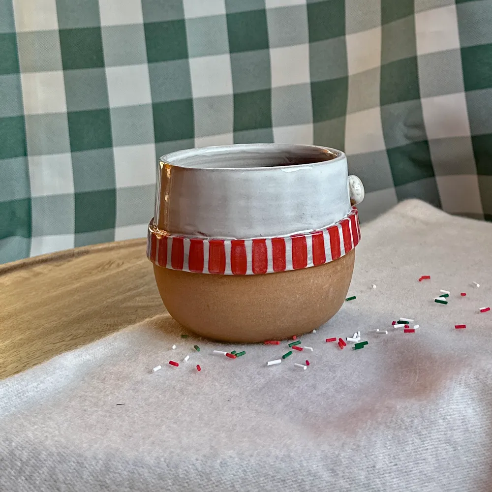 Środek pokryty białym szkliwem, dół kubeczka – surową przyjemna w dotyku gliną.