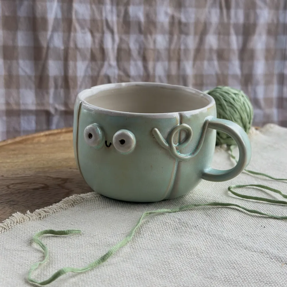 Kubek został wytoczony na kole garncarskim z jasnobeżowej gliny, następnie ręcznie malowany i szkliwiony.