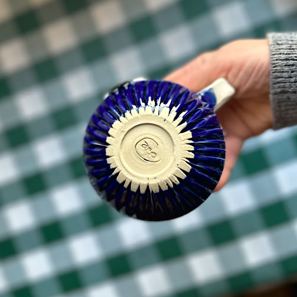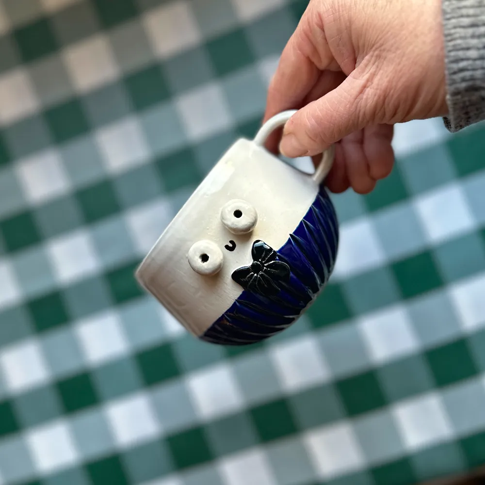 Kubeczek został wytoczony na kole garncarskim z jasnobeżowej gliny, następnie ręcznie malowany.