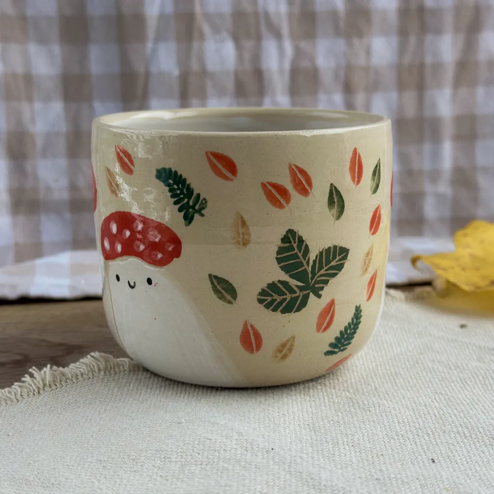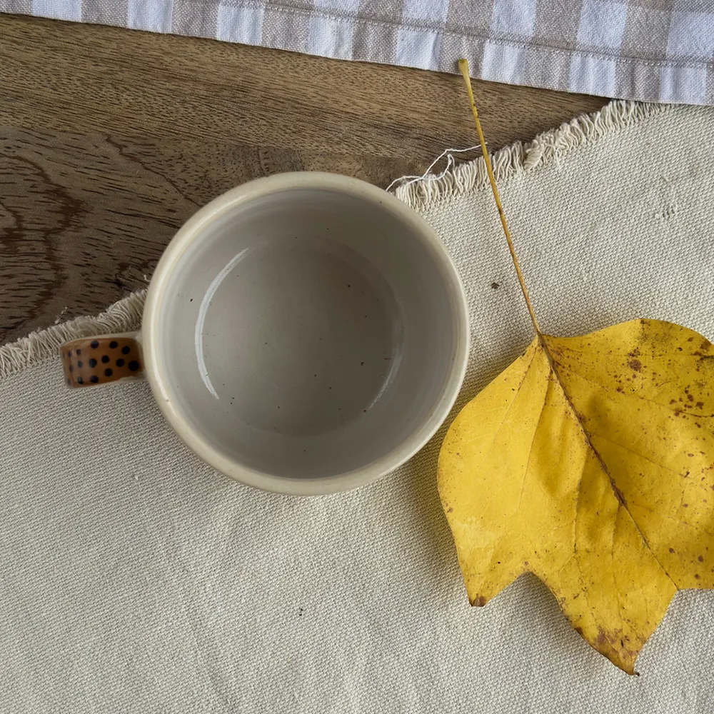 Kubek został wytoczony na kole garncarskim z jasnobeżowej gliny, następnie ręcznie malowany i szkliwiony.