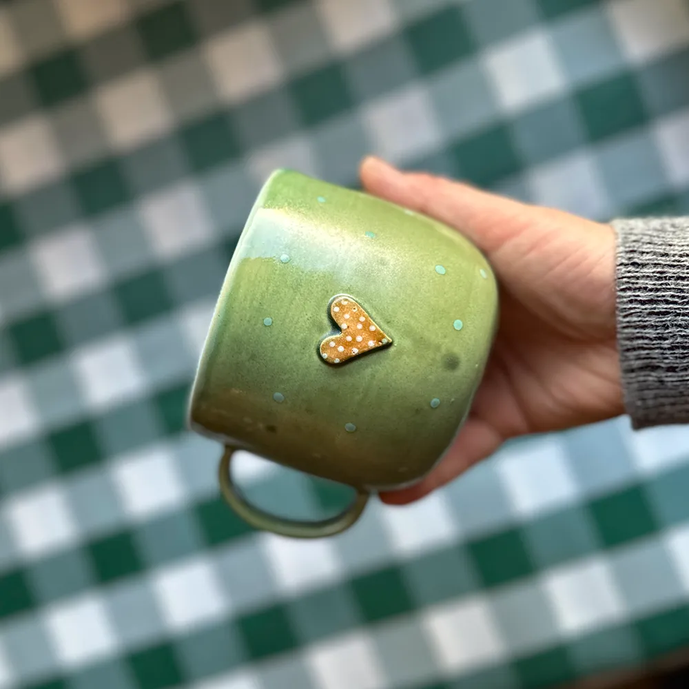 Kubeczek został wytoczony na kole garncarskim z jasnobeżowej gliny, następnie ręcznie malowany.