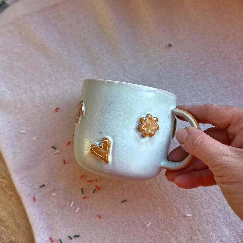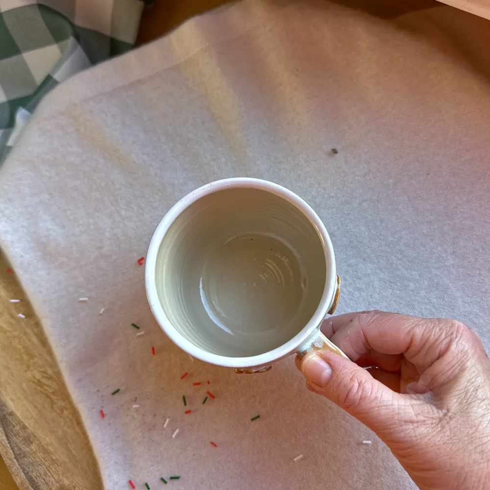Kubeczek został wytoczony na kole garncarskim z jasnobeżowej gliny następnie ręcznie malowany.