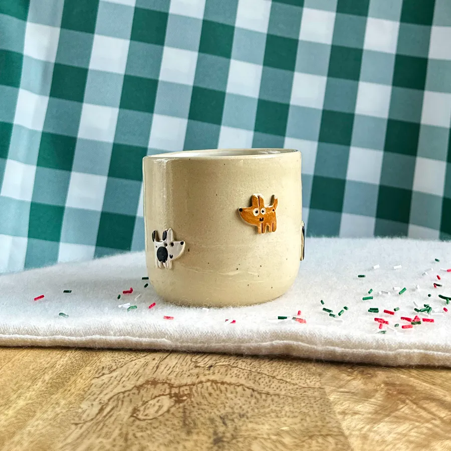 Kubeczek został wytoczony na kole garncarskim z jasnobeżowej gliny, następnie ręcznie malowany. Z tych dwóch powodów kubeczki mogą się różnić od siebie nieznacznie wymiarami, układem oraz wielkością zdobień.