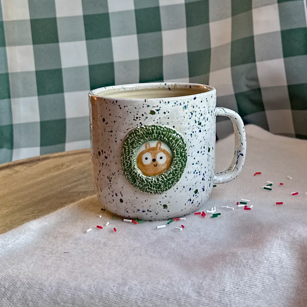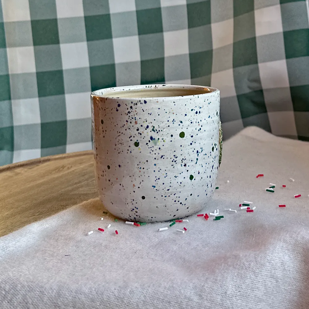 Kubeczek został wytoczony na kole garncarskim z jasnobeżowej, gliny następnie ręcznie malowany.