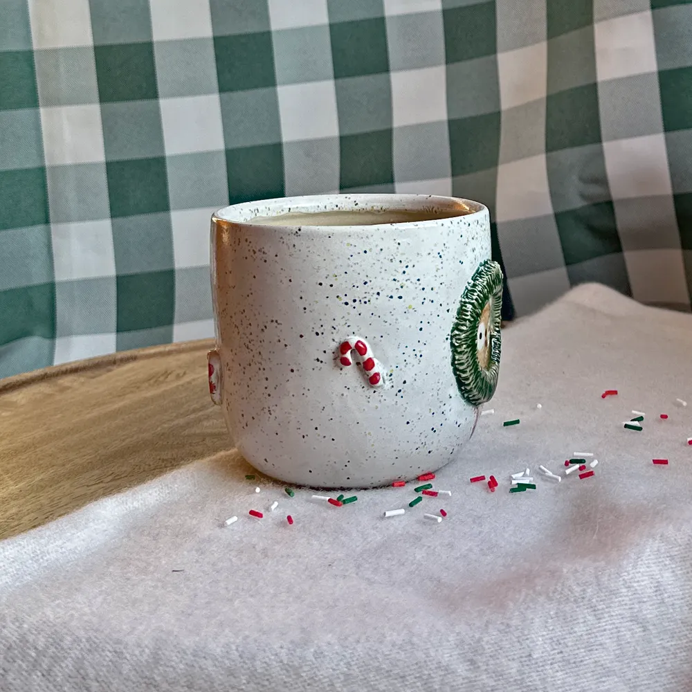 Kubeczek został wytoczony na kole garncarskim z jasnobeżowej, gliny następnie ręcznie malowany.