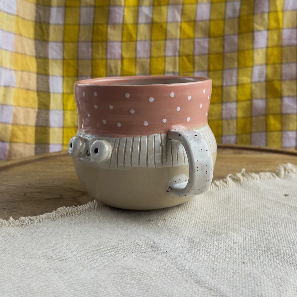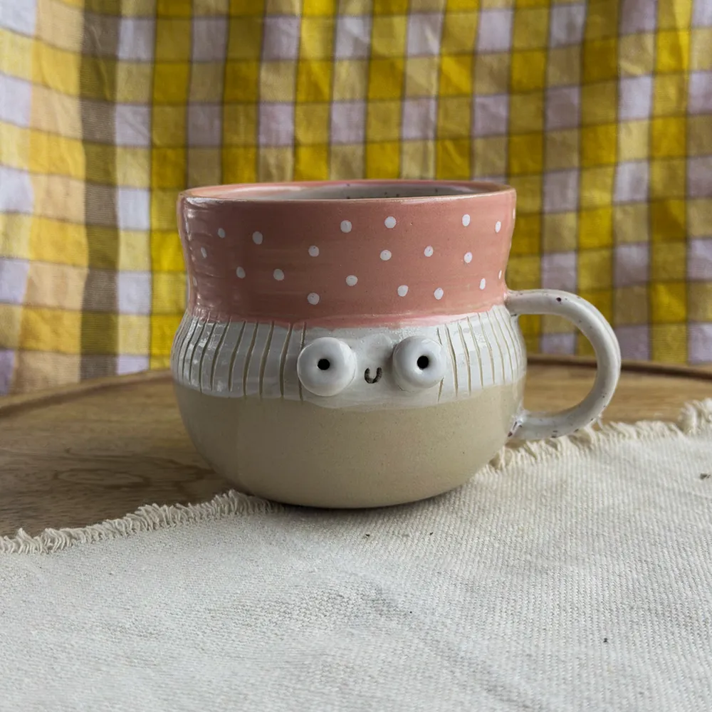 Kubeczek został wytoczony na kole garncarskim z jasnobeżowej gliny, następnie ręcznie malowany.
