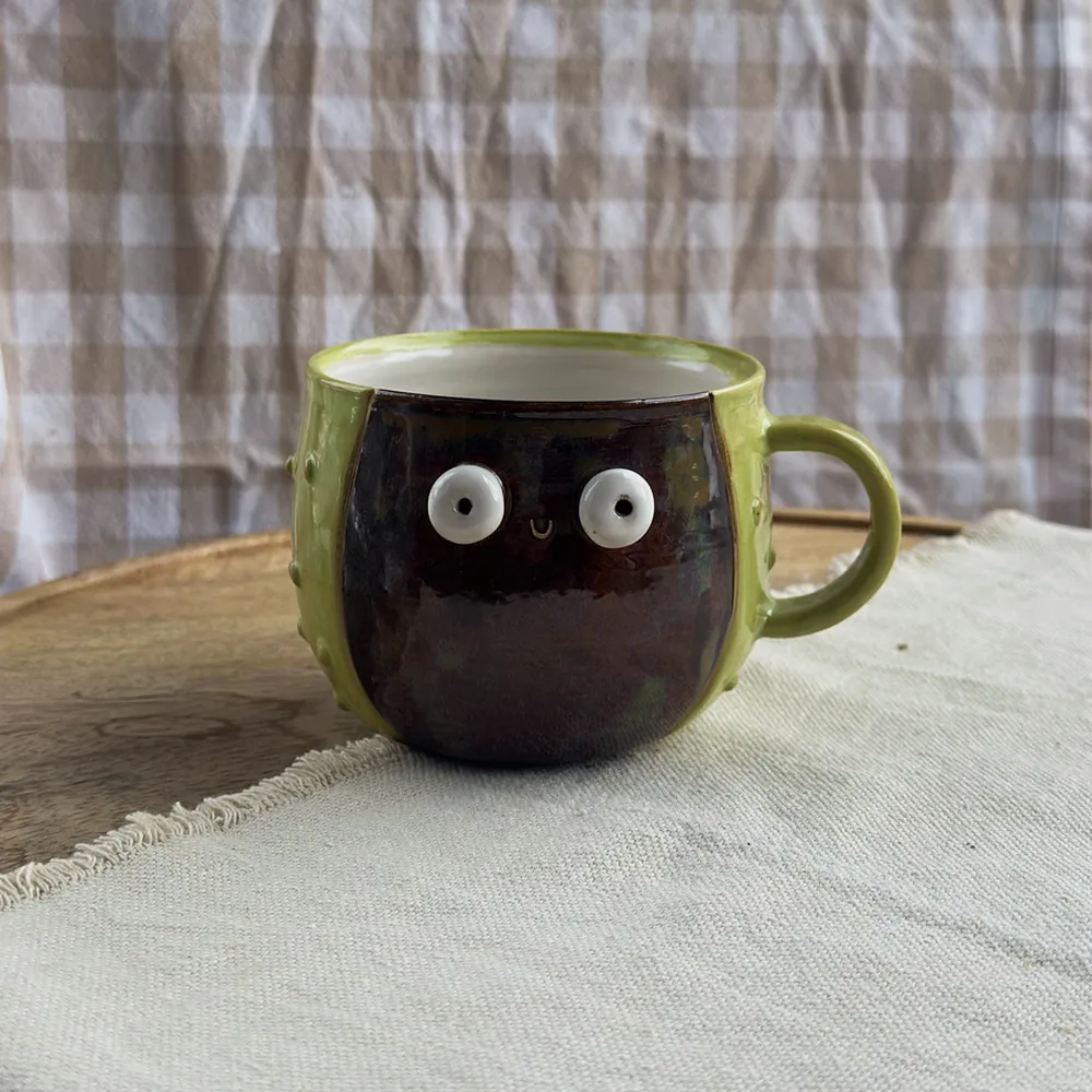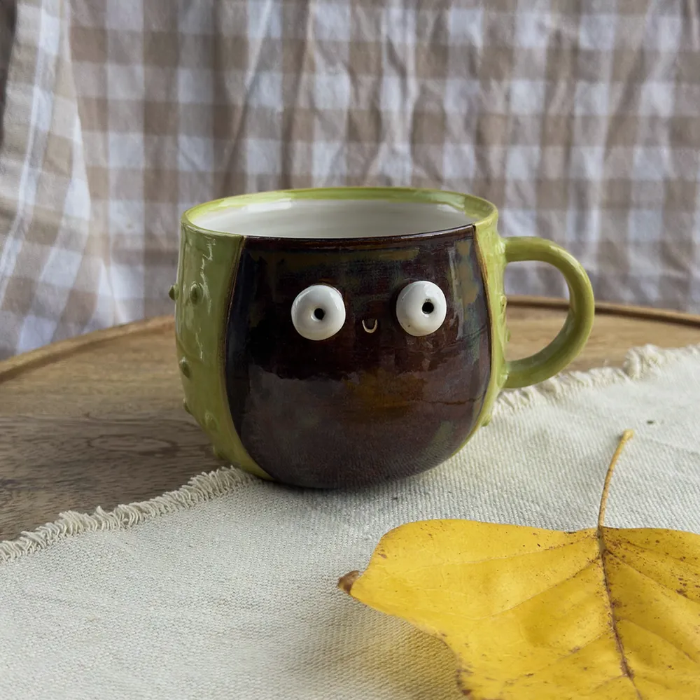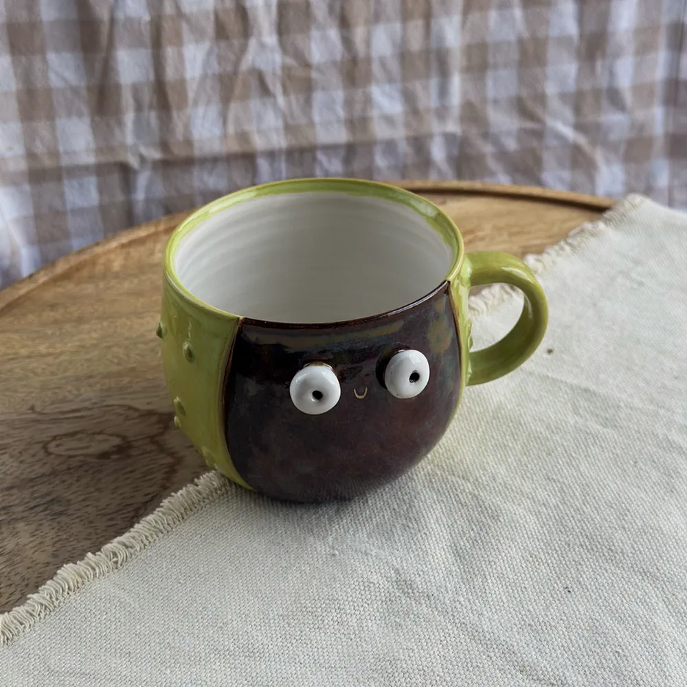 Kubek został wytoczony na kole garncarskim z jasnobeżowej gliny, następnie ręcznie malowany i szkliwiony.