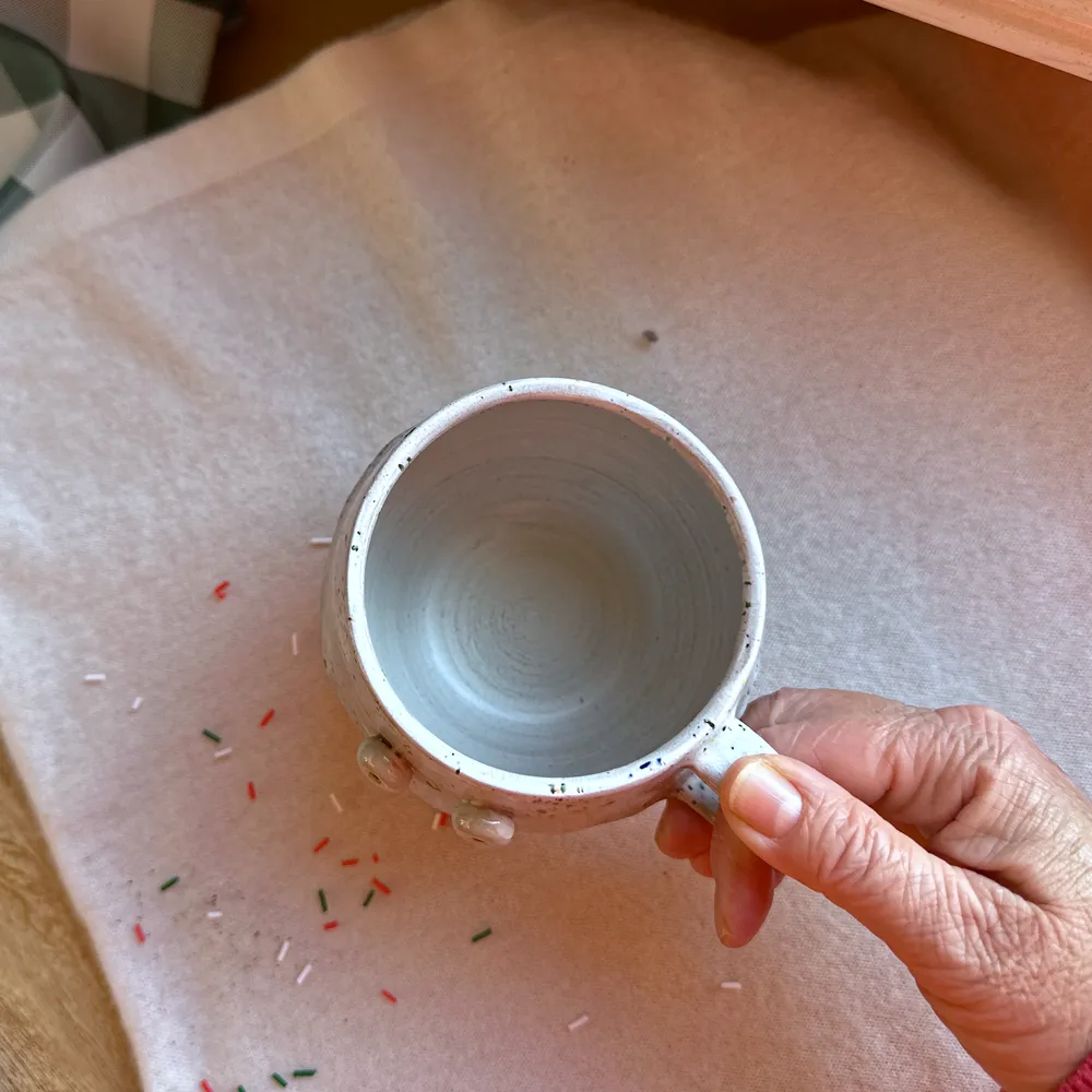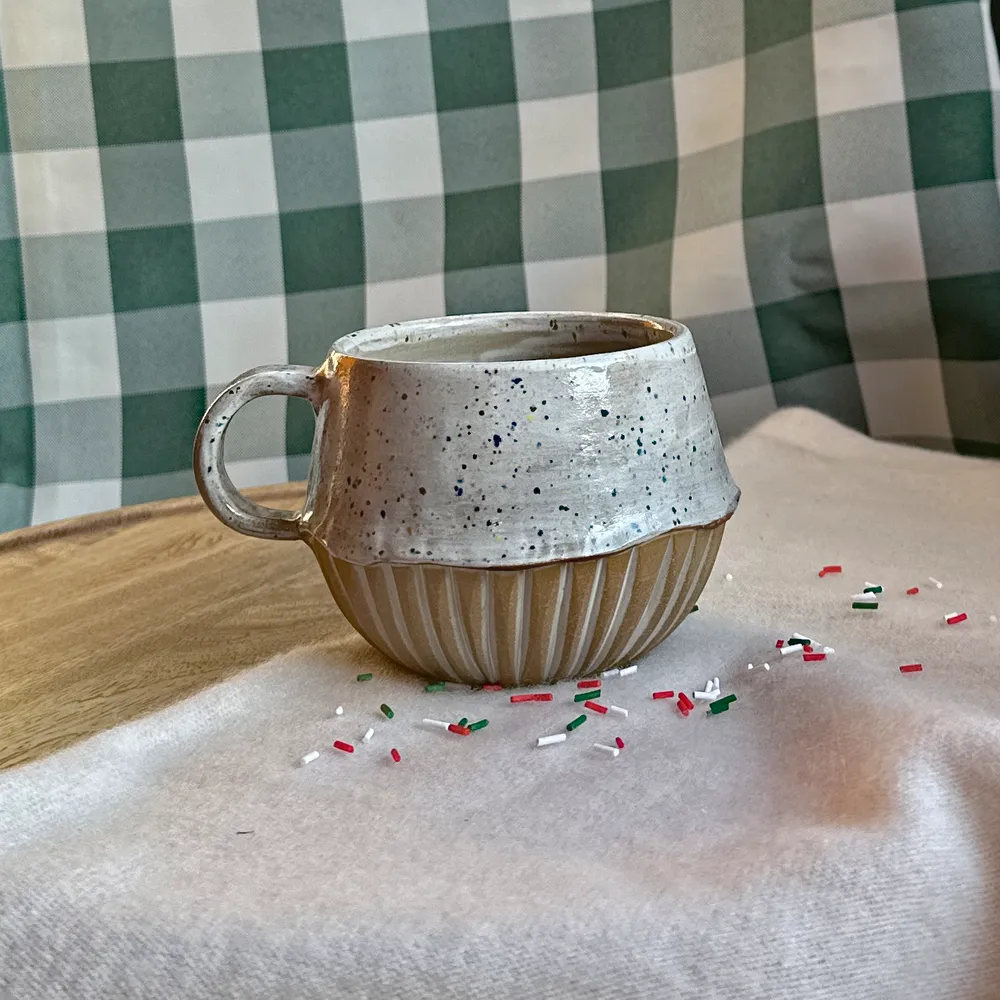 Środek oraz część zewnętrzna pokryta białym szkliwem, dół kubeczka – surową przyjemna w dotyku gliną z ozdobną ryflowaną strukturą