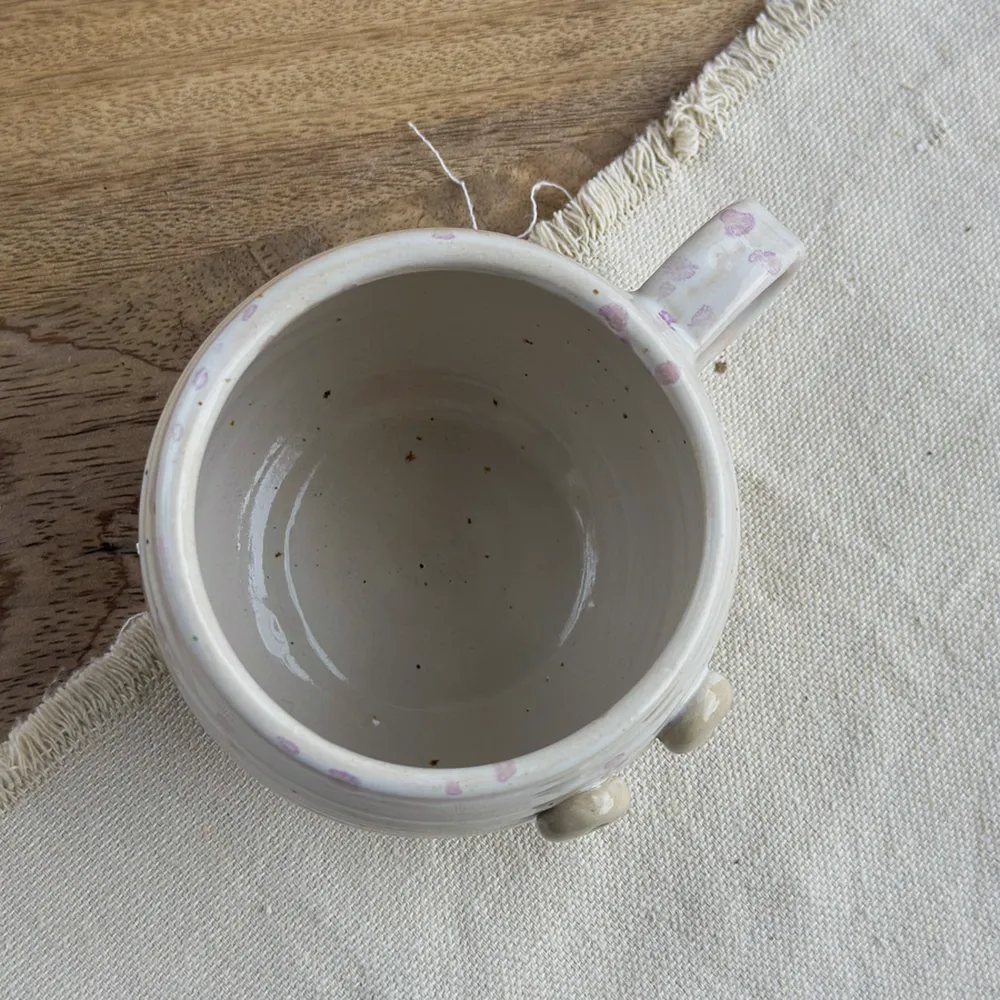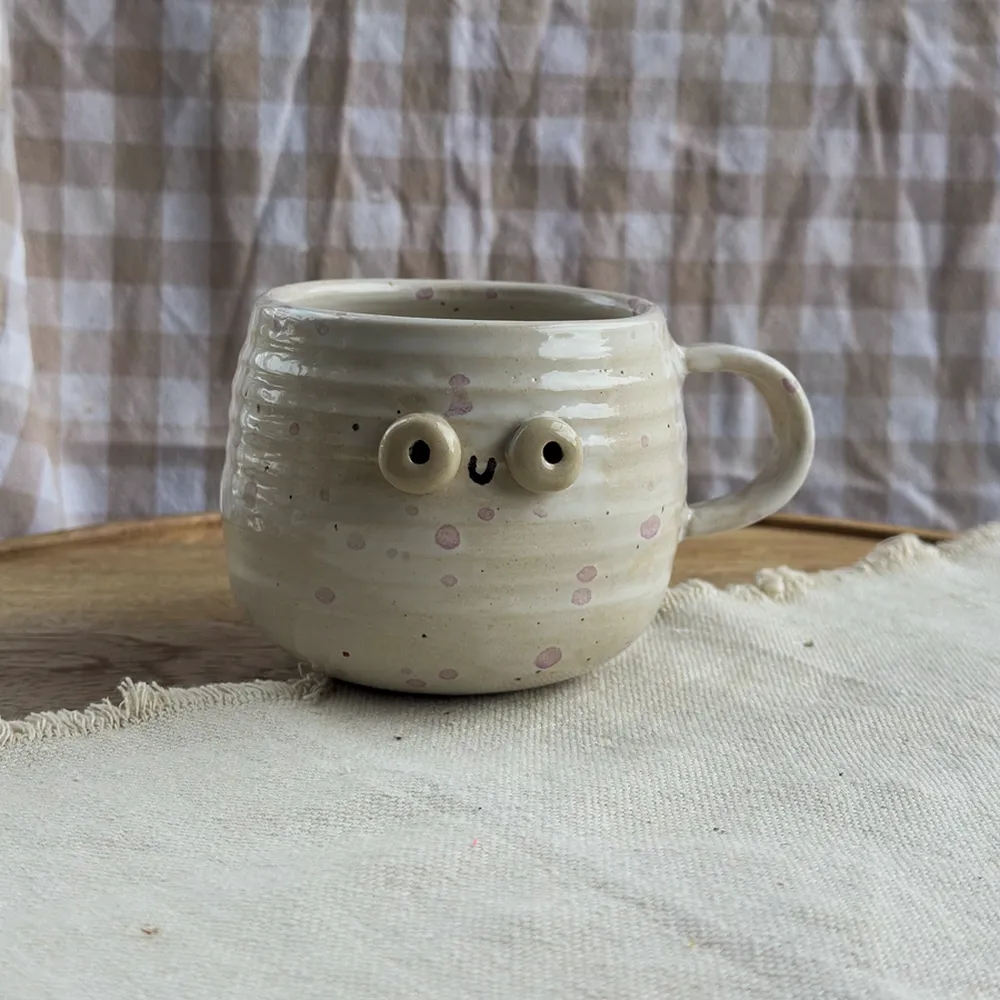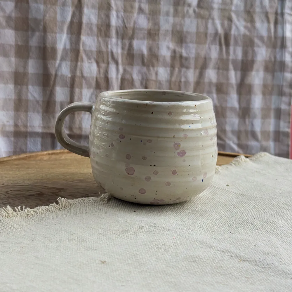 Kubek został wytoczony na kole garncarskim z jasnobeżowej gliny, następnie ręcznie malowany i szkliwiony.