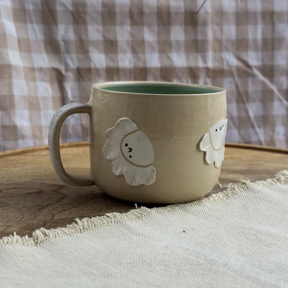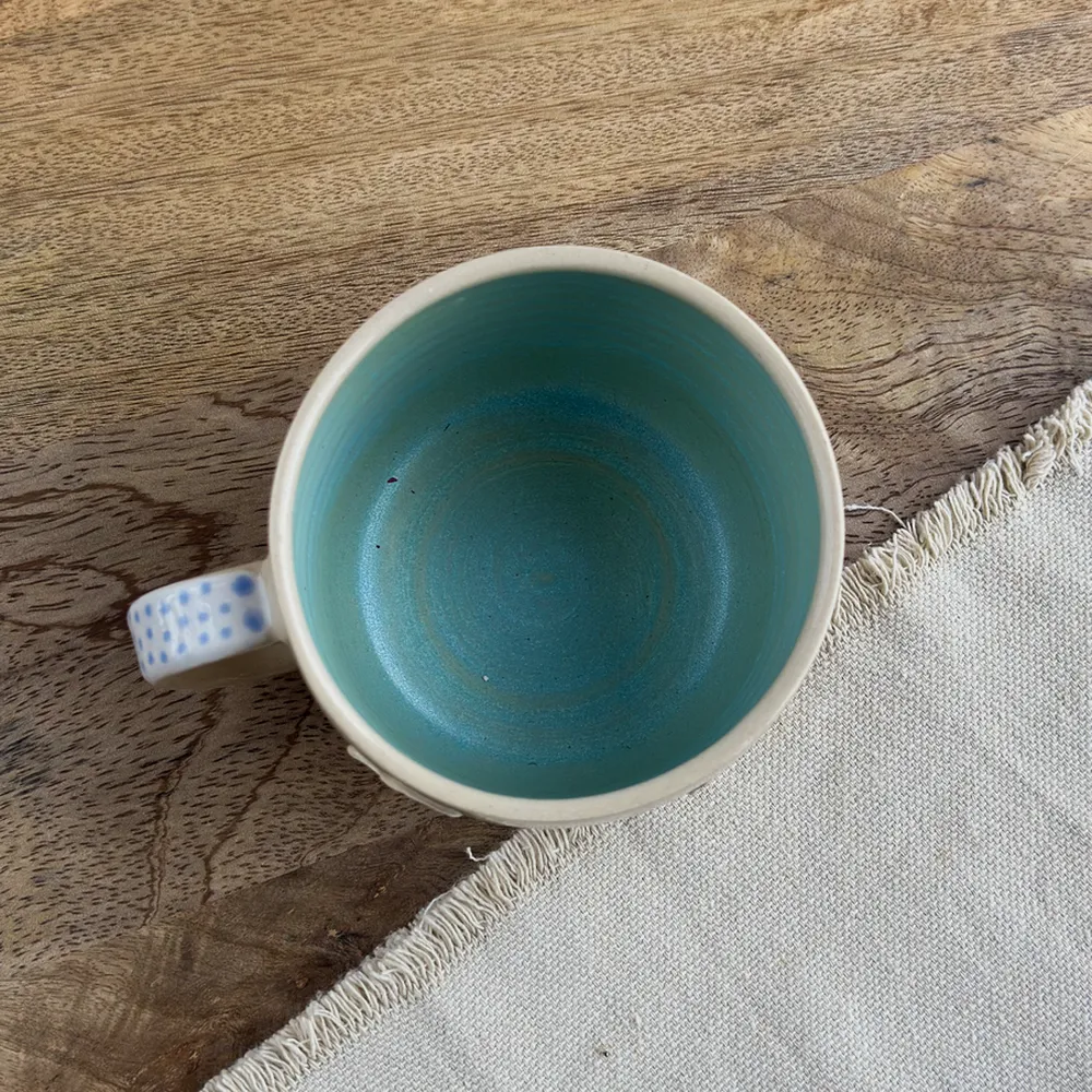Kubek został wytoczony na kole garncarskim z jasnobeżowej gliny, następnie ręcznie malowany i szkliwiony.