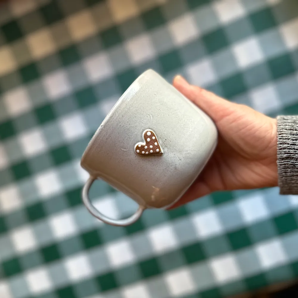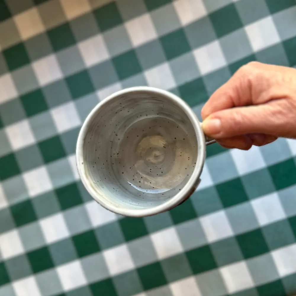 Kubeczek został wytoczony na kole garncarskim z brązowej gliny, następnie ręcznie malowany.