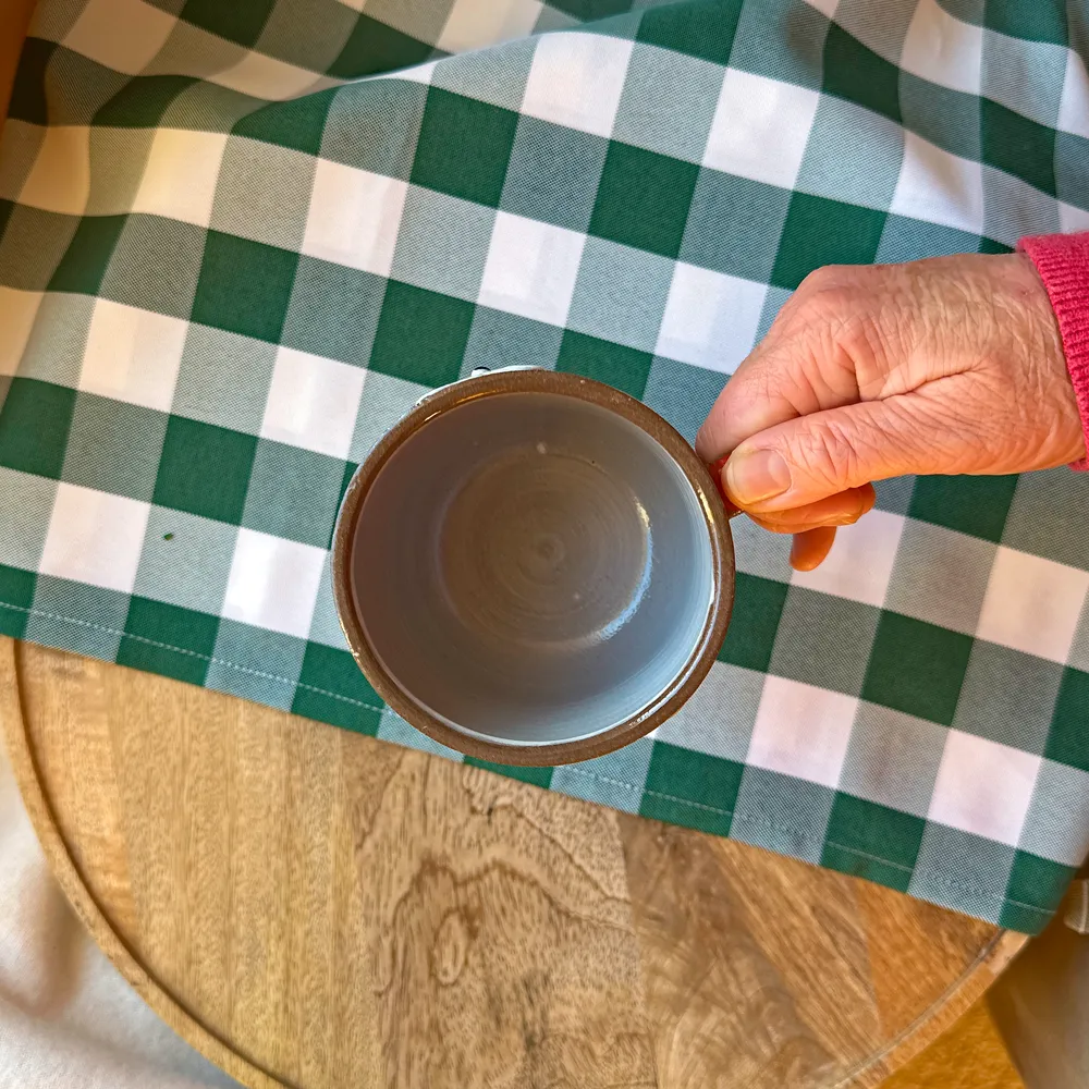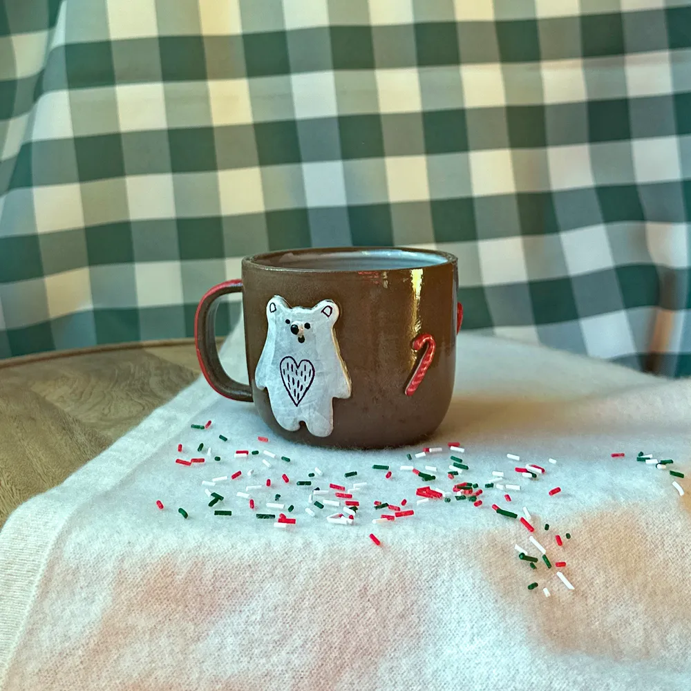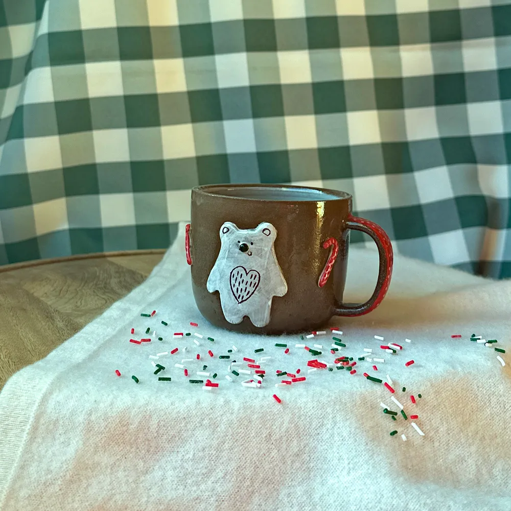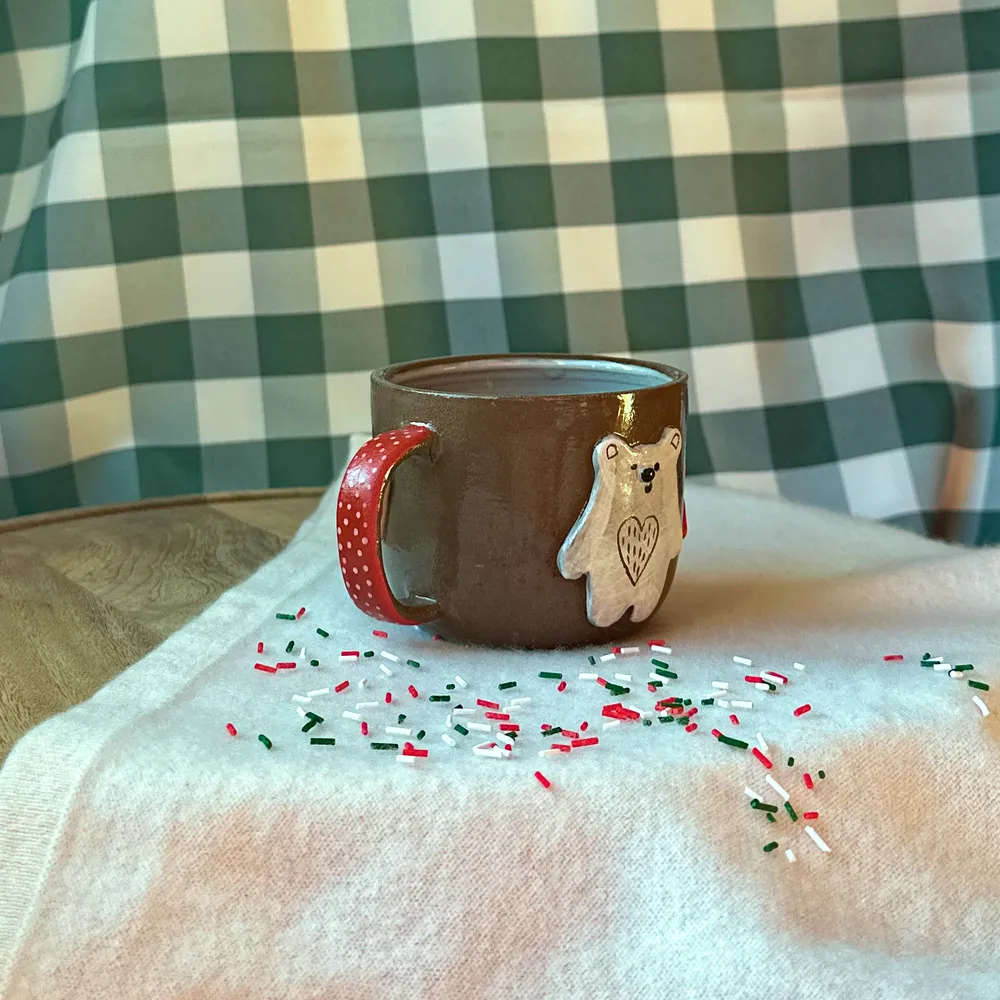 Kubeczek został wytoczony na kole garncarskim z brązowo-pierniczkowej gliny następnie ręcznie malowany.