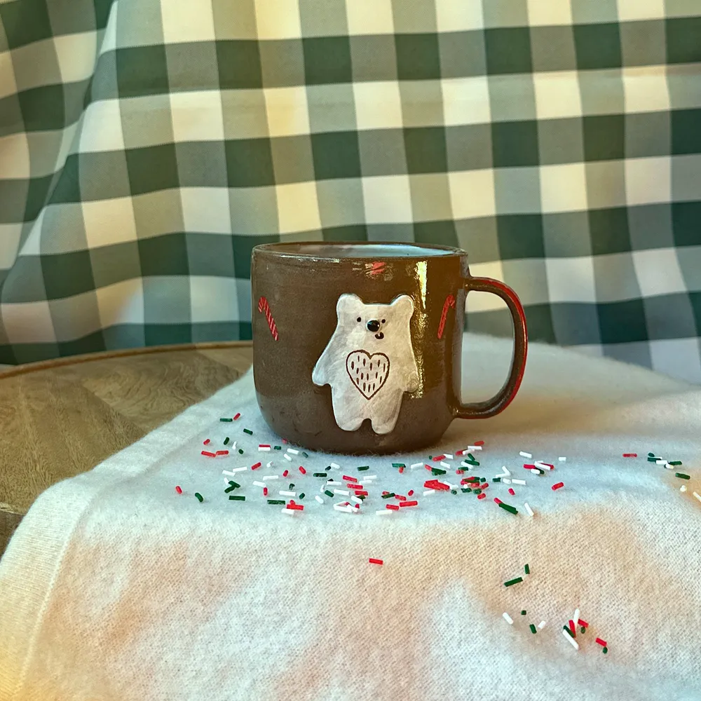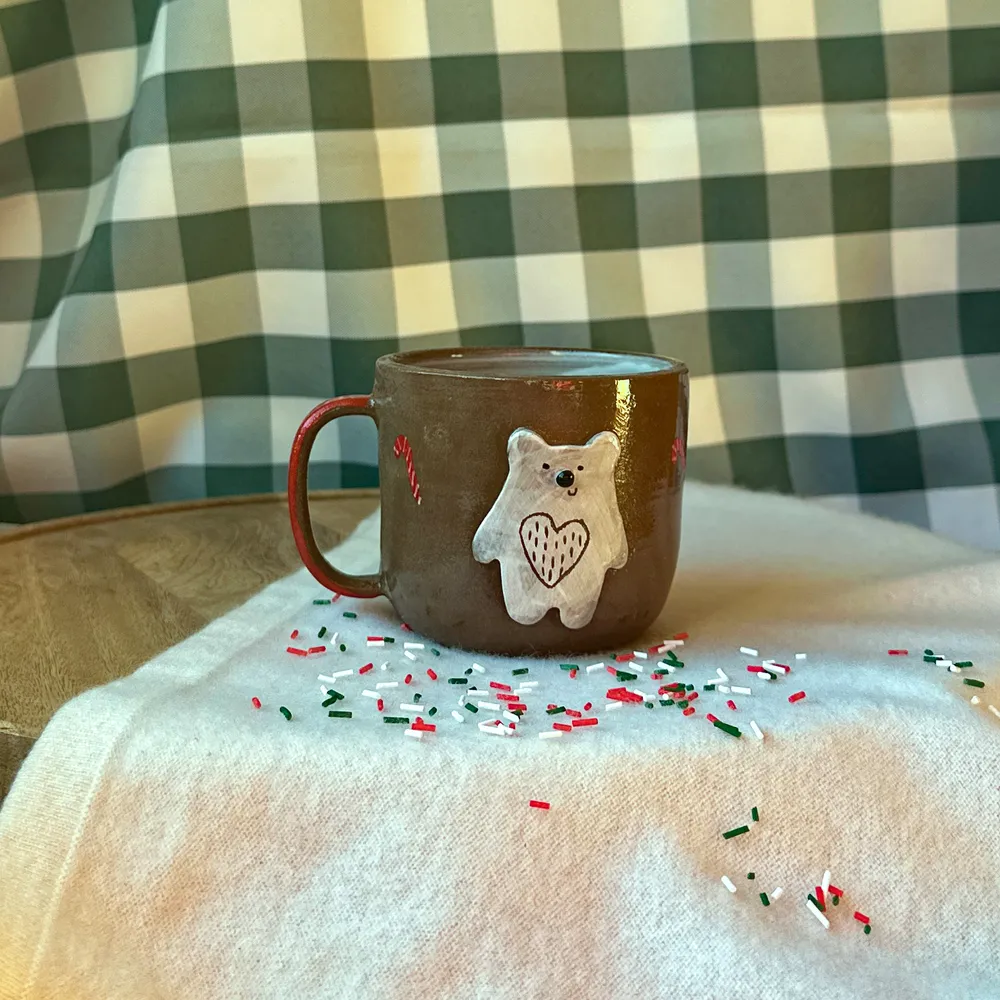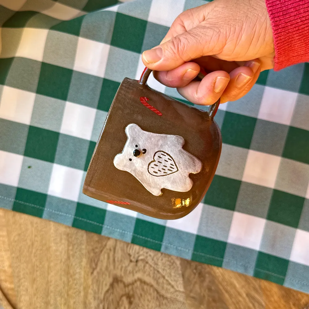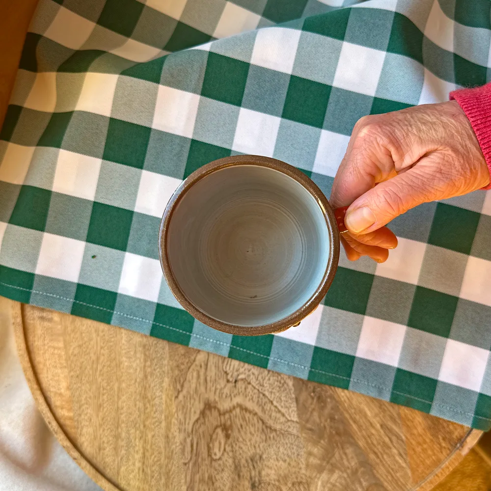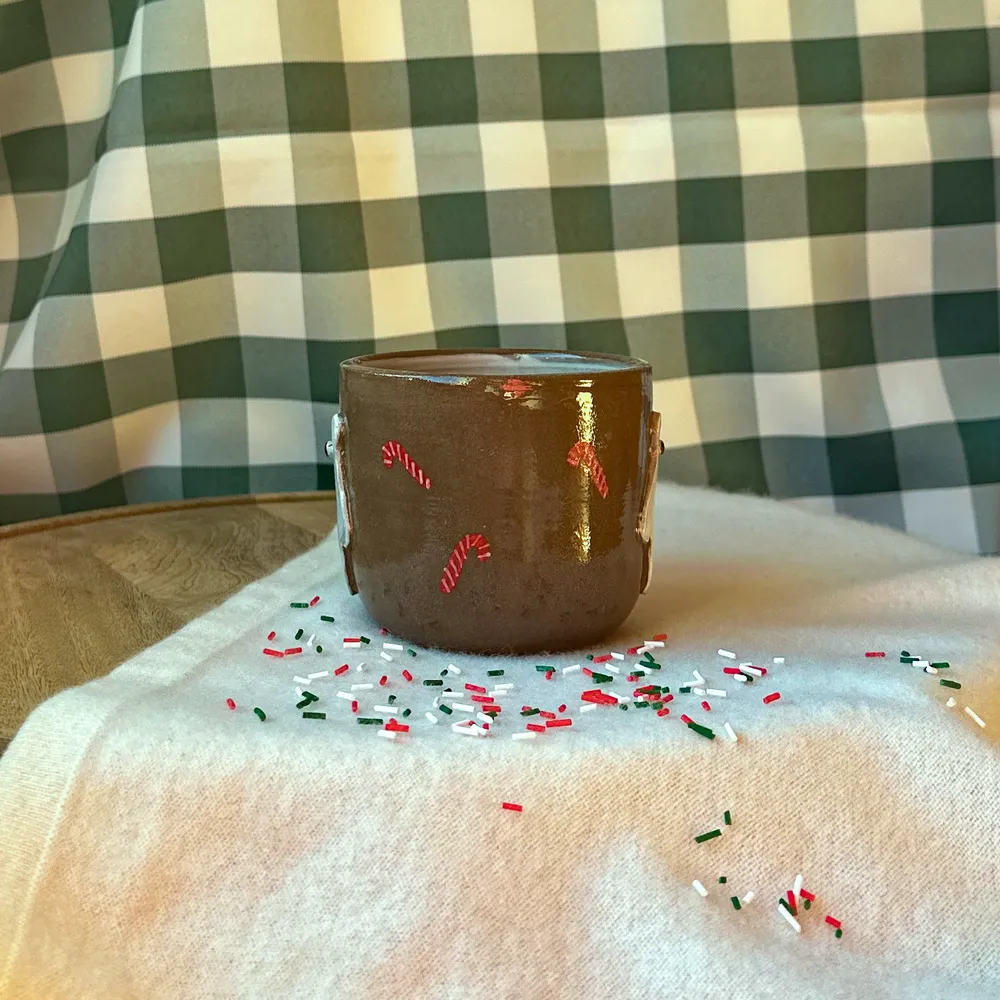 Kubeczek został wytoczony na kole garncarskim z brązowo-pierniczkowej gliny następnie ręcznie malowany.